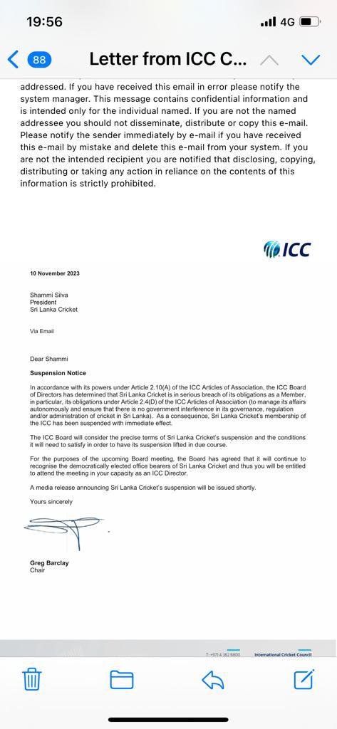 ICC ने बताया कि श्रीलंका क्रिकेट बोर्ड में सरकार की बहुत ज्यादा दखलअंदाजी हो रही थी। किसी भी ICC मेंबर के काम में सरकार का हस्तक्षेप नहीं होना चाहिए। लेकिन पिछले कुछ दिनों से श्रीलंका बोर्ड खुलकर काम नहीं कर पाया, जिसे देखते हुए बोर्ड को तत्काल प्रभाव से सस्पेंड किया जा रहा है।