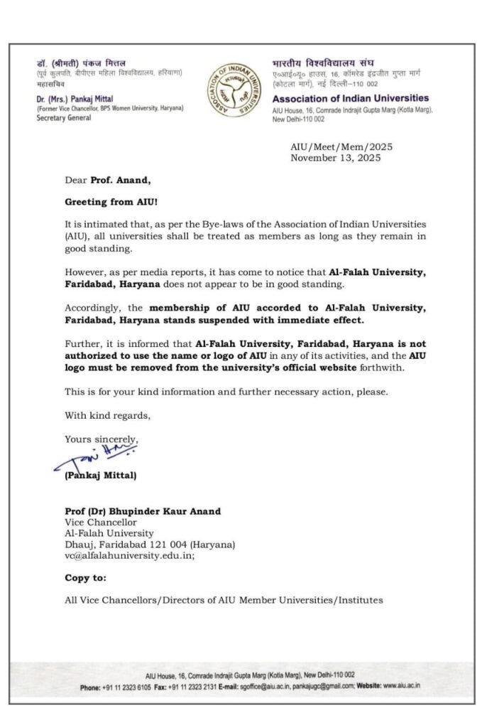 एसोसिएशन ऑफ इंडियन यूनिवर्सिटी (एआईयू) ने अल-फलाह यूनिवर्सिटी की सदस्यता तत्काल प्रभाव से रद्द कर दी है। संस्था का कहना है कि पिछले कुछ दिनों के घटनाक्रम यूनिवर्सिटी के आचरण से मेल नहीं खा रहे। वहीं दूसरी तरफ अल-फलाह यूनिवर्सिटी की वेबसाइट को एडमिनिस्ट्रेशन ने बंद कर दिया है।