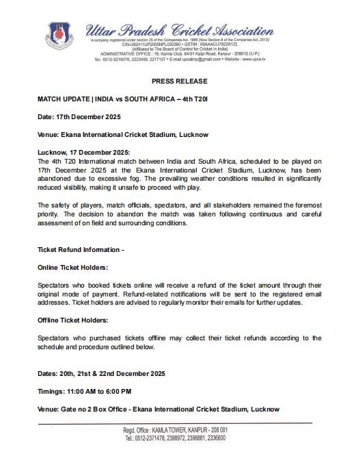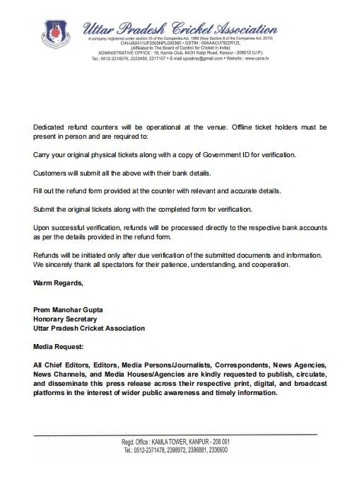 सफल सत्यापन के बाद रिफंड की राशि सीधे दर्शकों के बैंक खाते में ट्रांसफर की जाएगी. सभी रिफंड दस्तावेजों की जांच के बाद ही जारी किए जाएंगे. उत्तर प्रदेश क्रिकेट एसोसिएशन ने दर्शकों के धैर्य, सहयोग और समझदारी के लिए आभार व्यक्त किया है.