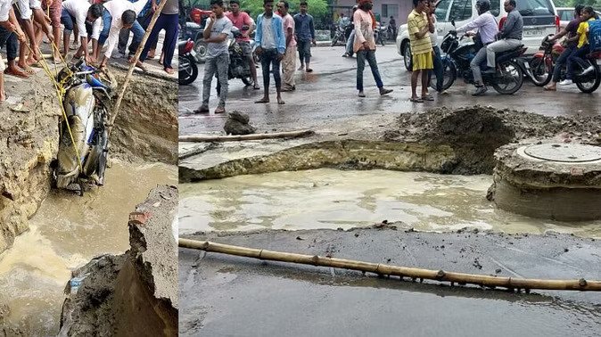 राजधानी लखनऊ के आशियाना इलाके में सड़क धंस जाने से एक बाइक सवार युवक अपने वाहन सहित गड्ढे में समा गया। घटना में युवक चोटिल हो गया है।