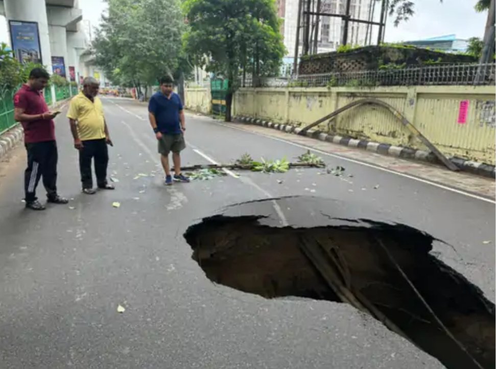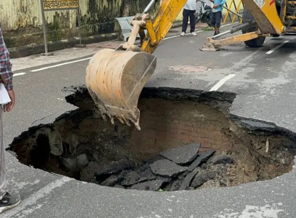 लखनऊ – कुछ देर की बारिश में लखनऊ युनिवर्सिटी के पास धसी सड़क