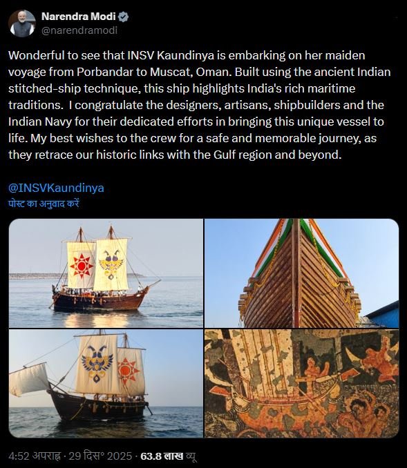 पीएम मोदी ने अपने एक्स पोस्ट में लिखा, यह देखकर बहुत अच्छा लगा कि INSV कौंडिन्य पोरबंदर से मस्कट, ओमान के लिए अपनी पहली यात्रा पर निकल रही है. प्राचीन भारतीय सिलाई वाली जहाज़ बनाने की तकनीक से बनी यह जहाज़ भारत की समृद्ध समुद्री परंपराओं को दिखाती है. मैं इस अनोखे जहाज़ को बनाने में उनके समर्पित प्रयासों के लिए डिज़ाइनरों, कारीगरों, जहाज़ बनाने वालों और भारतीय नौसेना को बधाई देता हूं. मैं चालक दल को सुरक्षित और यादगार यात्रा के लिए शुभकामनाएं देता हूं, क्योंकि वे खाड़ी क्षेत्र और उससे आगे हमारे ऐतिहासिक संबंधों को फिर से ताज़ा कर रहे हैं.