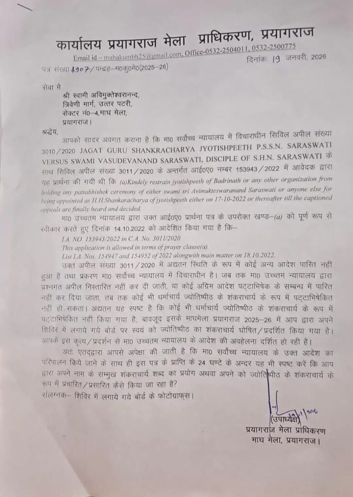 मेला प्राधिकरण ने नोटिस में सुप्रीम कोर्ट में विचाराधीन सिविल अपील का उल्लेख करते हुए कहा कि अभी तक इस संदर्भ में कोई आदेश पारित नहीं हुआ है, ऐसे में कोई भी धर्माचार्य ज्योतिष्पीठ के शंकराचार्य के रूप में पट्टाभिषेकित नहीं हो सकता। बावजूद इसके स्वामी अविमुक्तेश्वरानंद ने मेला क्षेत्र में लगे शिविर के बोर्ड पर अपने नाम के आगे ‘शंकराचार्य’ अंकित किया है।
