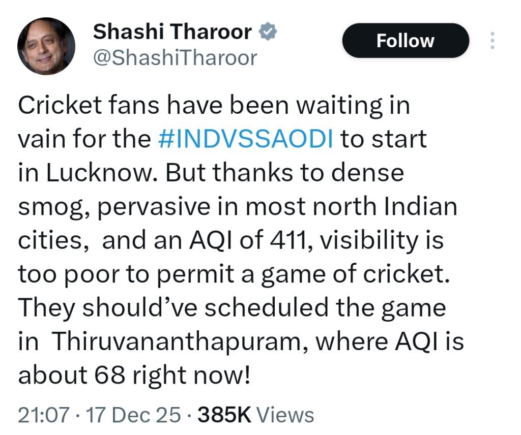 उन्होंने सोशल मीडिया प्लेटफॉर्म X पर लिखा, “लखनऊ में #INDVSSAODI शुरू होने का इंतज़ार कर रहे क्रिकेट फैंस को निराशा हाथ लगी। घने स्मॉग और 411 AQI के कारण दृश्यता बेहद खराब है। ऐसे में क्रिकेट खेला जाना संभव नहीं। यह मैच तिरुवनंतपुरम में होना चाहिए था, जहां इस वक्त AQI करीब 68 है।”