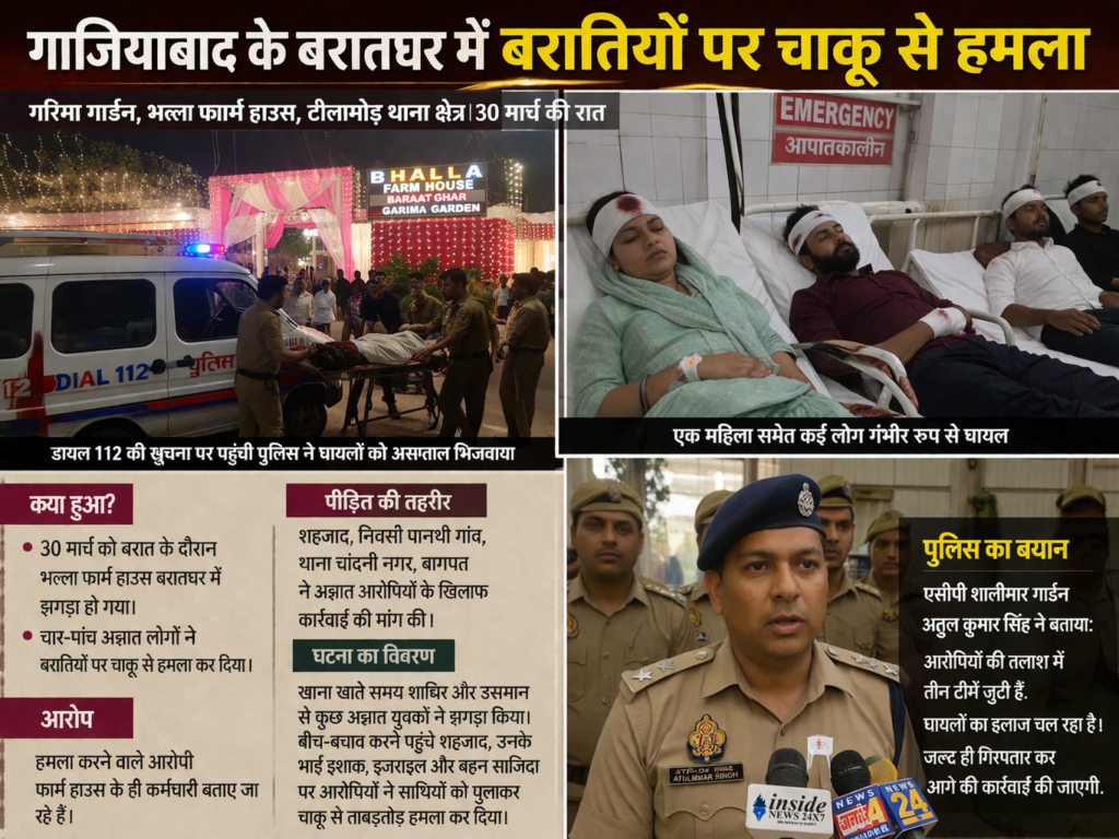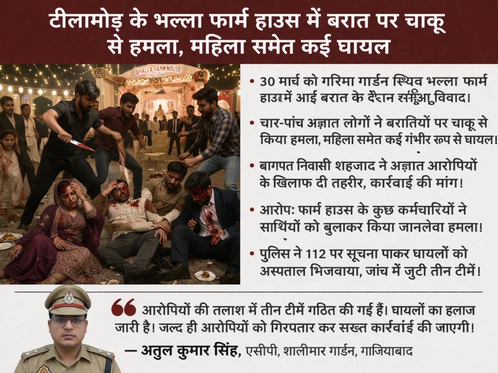 यूपी के गाजियाबाद स्थित टीलामोड़ थानाक्षेत्र के गरिमा गार्डन स्थित भल्ला फार्म हाउस बरातघर में 30 मार्च को आई बरात में झगड़ा हो गया। चार-पांच अज्ञात लोगों ने बरातियों पर चाकू से हमला कर दिया। इस दौरान एक महिला समेत कई लोग गंभीर रूप से घायल हो गए। डायल 112 की सूचना पर पहुंची पुलिस ने घायलों को अस्पताल भिजवाया। मामले में बागपत के चांदनी नगर थानाक्षेत्र स्थित पानथी गांव निवासी शहजाद ने अज्ञात आरोपियों के खिलाफ तहरीर देते हुए कार्रवाई की मांग की है।